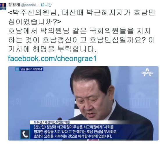 박주선은 호남 민심을 들먹이며 대선 패배 책임론과 재선거 패배 책임론을 들먹이며 문재인 퇴진과 친노 계파 청산을 해야 새정치 민주연합의 통합이 가능하다는 궤변을 뱉고 있습니다.